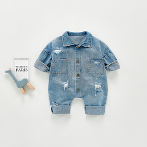 婴幼儿秋装时尚洋气牛仔连身衣男女宝宝长袖破洞哈衣爬...