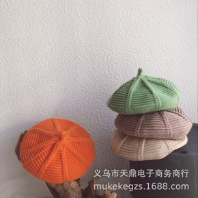 ins风纯色亮色系条纹包芯纱儿童贝雷帽 秋冬保暖针...
