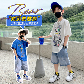 男童夏季套装2022新款男孩卡通短袖牛仔中裤两件套...