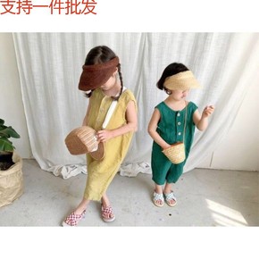 儿童连体裤清凉纯亚麻夏薄款韩国版男女无袖9分洋气背...