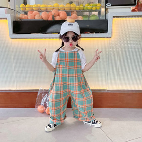 女童裤子格子吊带连体裤连身衣2022春夏装新款外贸...
