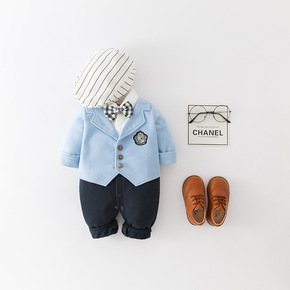 新款男童秋装长袖蓝色绅士领结哈衣婴儿连体爬服配帽2...
