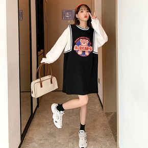 实拍孕妇秋装新款卫衣卡通小熊假两件孕妇裙宽松中长款...