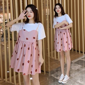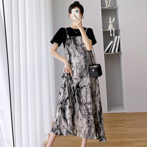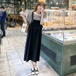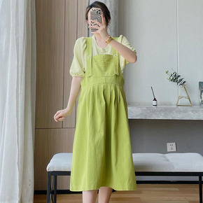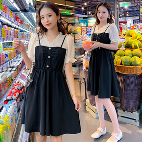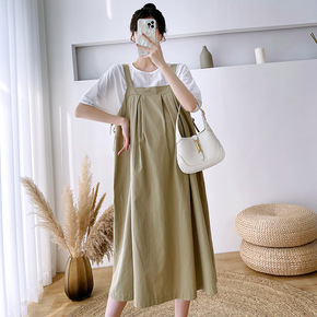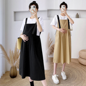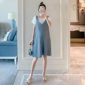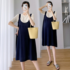 孕妇夏装套装夏款时尚假两件套孕妇连衣裙中长款背带裙...