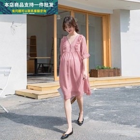 孕妇装夏季连衣裙小个子两件套装收腰松紧可调节短袖裸...