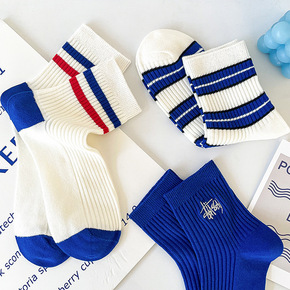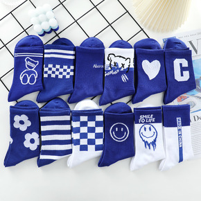 克莱因蓝色字母刺绣条纹潮流女士短袜批发波浪方格笑脸...