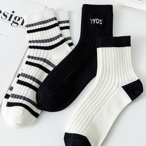 黑白袜子女中筒袜春季ins潮夏季韩国日系拼色条纹百...
