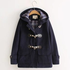 秋冬新款学生连帽学院风藏青色外套女加厚夹棉牛角扣毛...