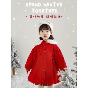 艾摩贝贝女童红色喜庆毛呢子外套韩版童装儿童新年夹棉...