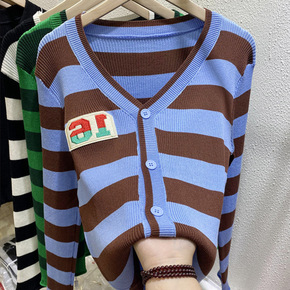 条纹针织开衫女2021年新款再求港风短款毛衣外套网...