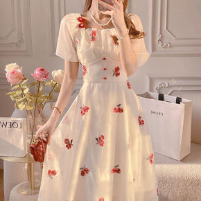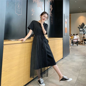 法式小众很仙的连衣裙女夏新款收腰网纱拼接显瘦学生裙...