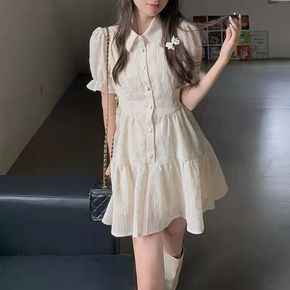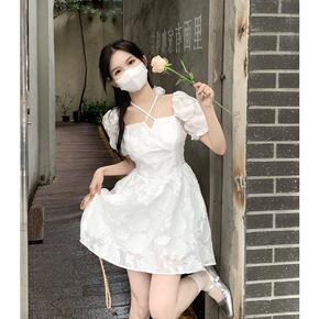 实拍小清新连衣裙法式泡泡袖小众别致连衣裙收腰高级感...