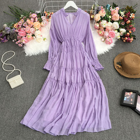 波西米亚度假连衣裙秋装2021年新款女神范气质V领...
