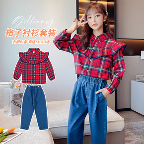 小熊格子衬衫学院风宽松复古上衣女秋冬款...