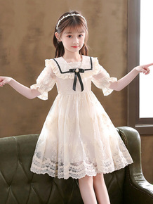新款纯色童装连衣裙棉麻蕾丝花边公主裙系带女孩连衣裙...