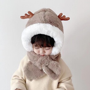 可爱鹿角儿童帽子围巾一体帽秋冬加绒加厚保暖男童女童...
