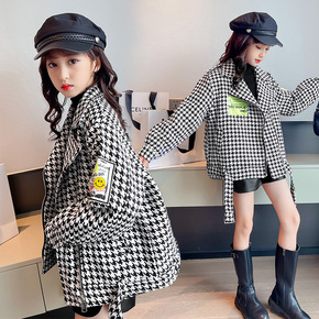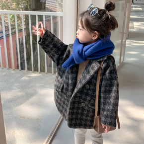女童童装冬季宝宝韩版洋气中长款千鸟格子夹棉品质呢大...