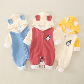 韩版婴儿保暖连体衣服冬季夹棉加厚纯色宝宝哈衣外出连...