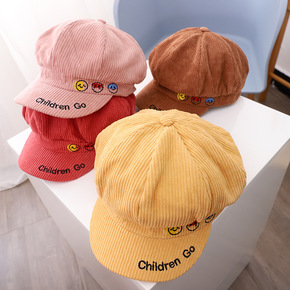 灯芯绒贝雷时尚百搭鸭舌帽女童八角英伦风男儿童简约刺...
