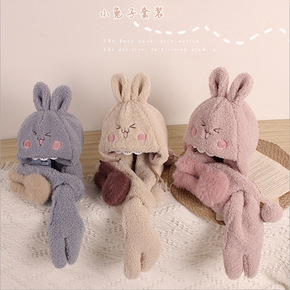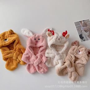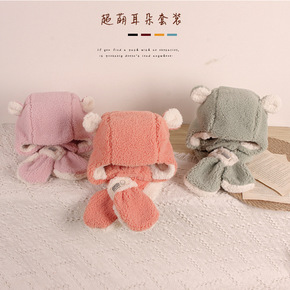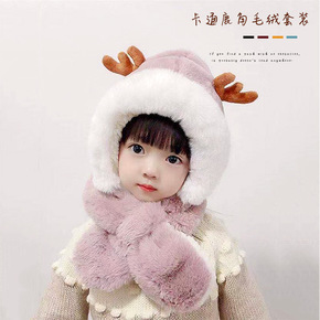 儿童毛绒护耳帽韩范秋冬卡通加厚保暖一体套装帽宝宝围...