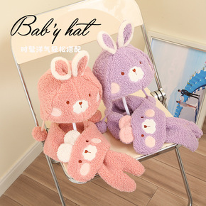 秋冬可爱长耳朵拼色羊羔绒儿童帽子围巾套装 可爱宝宝...