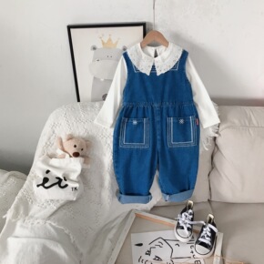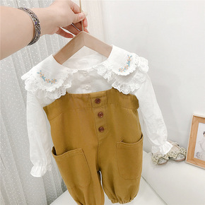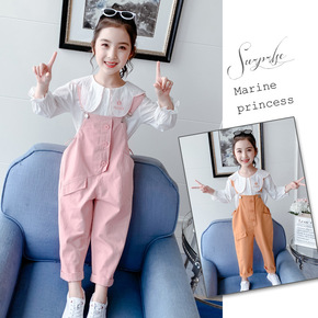 2020秋装新款女童背带裤套装儿童装女孩花朵领衬衫...