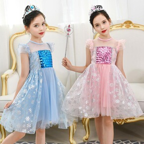 2021欧美新款冰雪奇缘长袖亮片艾莎演出儿童礼服公...