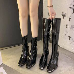 瘦瘦靴肯豆长筒马丁靴女粗高跟瘦瘦鞋子高筒骑士靴女漆...