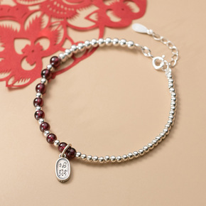 925银招财牌银珠石榴石水晶带延长链手链 diy手...