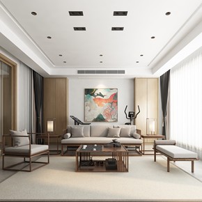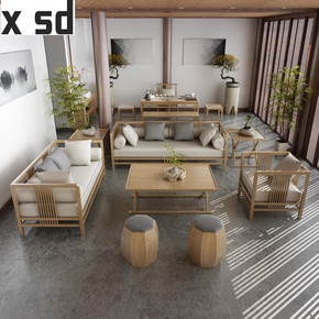 新中式客厅实木沙发组合 现代简约禅意布艺别墅民宿酒...