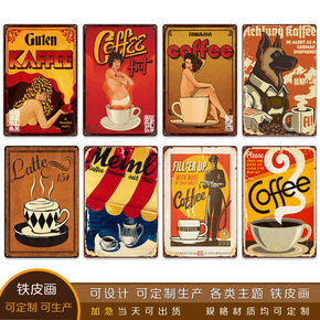 厂家直销外贸新款咖啡复古海报铁皮画背景墙壁工业风无...