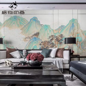 现代中式青绿山水背景墙风水聚财壁纸客厅茶室背景云雾...
