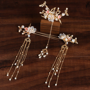 古典红色花卉发带古装宫廷发饰新娘复古盘发头饰耳饰配...