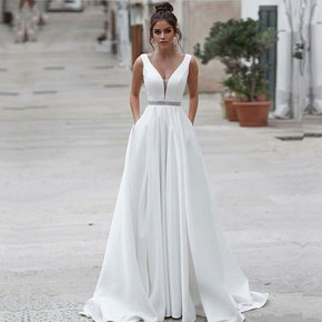 轻婚纱 缎面2022新款小个子新娘复古赫本深V领结...