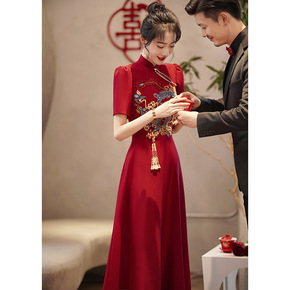 改良旗袍敬酒服新娘夏季小个子质感礼服裙中式酒红色订...