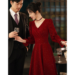 敬酒服新娘2022新款酒红色气质长袖礼服裙小个子订...