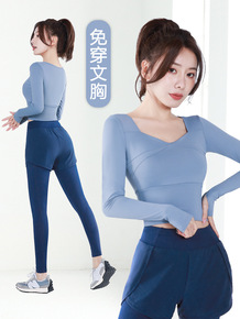 瑜伽服女带胸垫跑步健身长袖运动上衣显瘦弹力紧身假两...