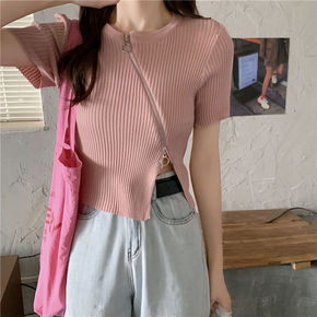 别致绝美针织衫短袖上衣夏季气质小衫新款拉链设计感小...