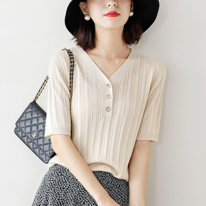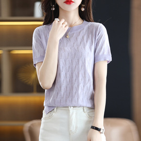 春夏薄款纯色羊毛针织短袖女宽松圆领显瘦镂空打底衫棉...