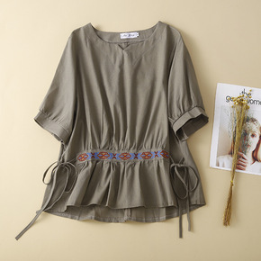 现货2022夏季新款复古棉麻v领常规绣花棉麻系带短...