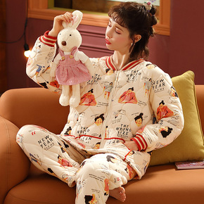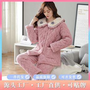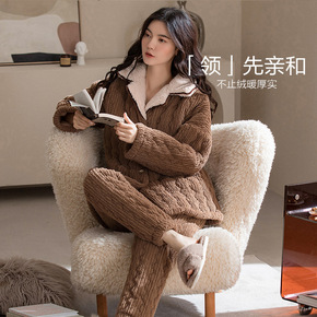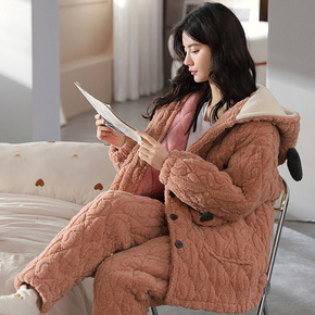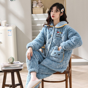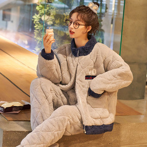 睡衣女秋冬季加厚加绒珊瑚绒三层夹棉袄冬天法兰绒保暖...