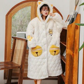 珊瑚绒夹棉睡衣女秋冬加厚加绒保暖三层法兰绒棉袄长款...