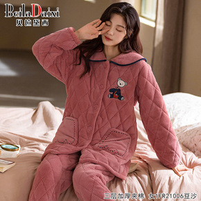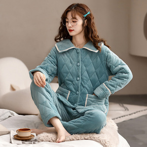 睡衣女冬季加厚三层夹棉棉冬天保暖秋冬女款休闲家居服...