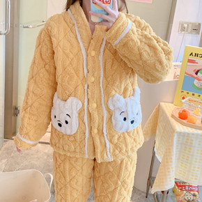 睡衣女秋冬季珊瑚绒加厚加绒三层夹棉法兰绒可爱女士家...