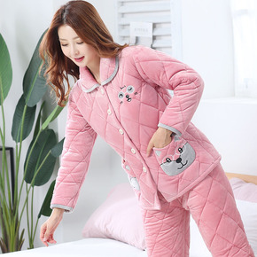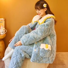 睡衣女冬季冬天珊瑚绒法兰绒夹棉袄三层加厚超厚加绒家...