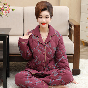秋冬季中年妈妈睡衣女纯棉长袖夹棉夹层春秋款加厚家居...
