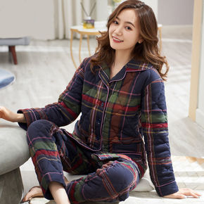 睡衣女秋冬长袖两件套空气棉夹层纯棉加厚韩版家居服套...
