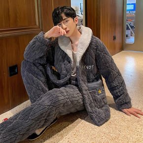 睡衣男士冬季三层加厚保暖珊瑚绒夹棉秋冬棉袄简约大方...