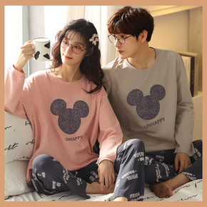 情侣睡衣秋季长袖纯棉圆领大码卡通睡衣女冬男式家居服...