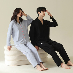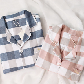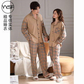 高品质 纯棉磨毛男女情侣款长袖格子纯色睡衣套装家居...
